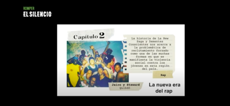 • Chapter 2: The New Age of Rap - The story of The New Saga, a rap group from Quibdó, tells of forced recruitment into criminal gangs as one of the many manifestations of the social violence against young people in Columbia, which led to the death of four of its members. It also introduces the efforts of people like Stiwar Palacios, with his initiative called Conscious Minds, which works to free young people from the conflict. Click here for a full description in Spanish.