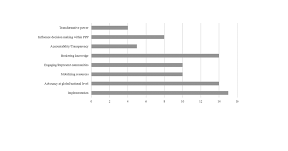 - Although their definitions of "civil society" are often vague, many of the partnerships emphasise the value of civil society participation in their work. The most commonly specified role is as implementing partners at the country level (n = 15). Many also emphasise civil society's advocacy role (n = 14), which can entail both raising awareness about the partnership's issue and raising political and donor support. In addition, several partnerships (the International Vaccine Institute, Drugs for Neglected Diseases Initiative [DNDi], SUN, the Global Alliance for Clean Cook Stoves, the Global Fund, and Stop TB) have set up "support committees", "champions", "ambassadors", or "friends" networks to mobilise high-level individuals, including some from "civil society" such as artists and celebrities, to advocate for the partnerships. Moreover, most of the partnerships expect their civil society partners to broker knowledge (n = 14), which often implies providing feedback from the ground to ensure effective implementation of partnership-funded programmes. Despite the emphasis on representation and local knowledge, less than half of the partnerships explicitly state that civil society has a role in influencing decision-making at the global level (n = 8). Similarly, only some (n = 5) explicitly refer to civil society's "watchdog" function in ensuring accountability and transparency, whether in governance processes or in programme implementation.