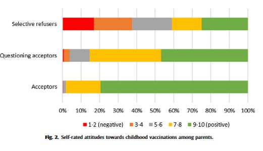 Parents were categorised as: (i) acceptors (79%): vaccinated with all vaccinations offered within the NIP, (ii) questioning acceptors (19%): vaccinated but felt hesitancy towards at least one vaccination, and (iii) selective refusers (2%): actively refused or delayed at least one vaccination for other than medical reasons. (None of the parents rejected all vaccinations for their child.) When excluding responses for human papillomavirus (HPV) vaccination, the proportion of acceptors increased to 91%. Among acceptors, 97.3% had the intention to vaccinate next time, in contrast to 88.8% of questioning acceptors and 34.6% of selective refusers.