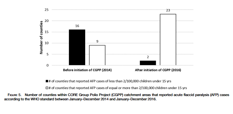 - Analysis of data from 25 counties in the conflict-affected states of Upper Nile, Jonglei, and Kapoeta East county before the initiation of the CBS from January to December 2014 and other data for the period January-December 2016 after the initiation of the CBS system in these CGPP catchment areas indicated that there was substantial increase in the number of counties that reported AFP cases in 2016 compared with 2014 before the introduction of the CBS system.