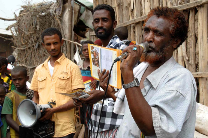 Information for this report was gathered through interviews and a workshop attended by 120 SMC members and HEWs. The reader can learn about the approaches to behaviour change the project undertook in the 4 different settings through the words of the participants themselves. For example, at market places: Kedir Biru Mulat, Disease Prevention and Health Promotions Coordinator, Yalo District, said: "I'm 28 and I’ve worked six years in here Yalo....Vaccination is a highly sensitive issue for our community. So when we go to the market, we also bring along a SMC member with us....Then we enter into the market place, and we will use the megaphone to deliver the messages. It's very important to have the local leaders along with us because people will gather and listen to them. We also run a competition where spectators can win phone cards - we read out the number and the first to punch the numbers into their phone wins. This way people stay and listen to our messages....I can witness that people's perceptions are changing. Now we are achieving good results and the number of children brought to us to be vaccinated is going up."
