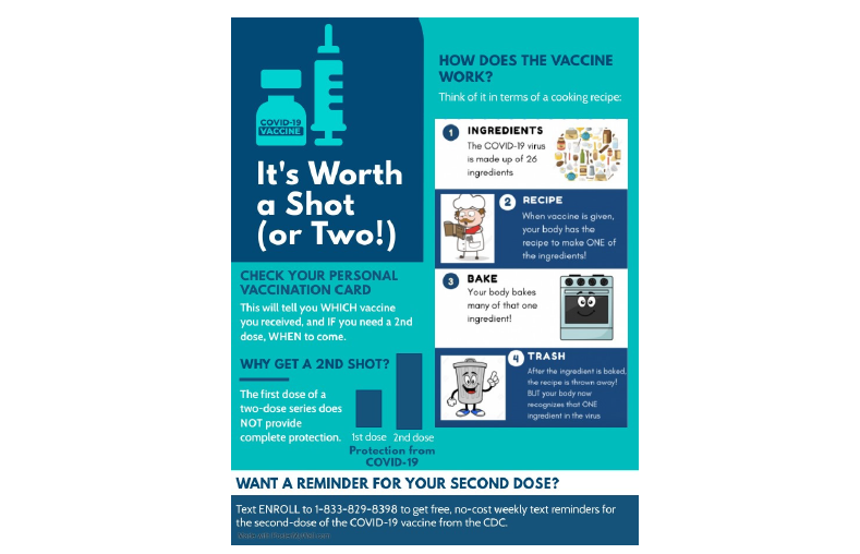 Vaccines requiring multiple doses, as is the case with all but one of the COVID-19 vaccines in use in the world as of this writing, pose a challenge to ensuring the world's population achieves a sufficient level of immunity against COVID-19. The surge of misinformation that has accompanied the pandemic exacerbates this situation. First-time recipients of multidose COVID-19 vaccines remain prone to vaccine hesitancy even after receiving a first inoculation, and they may become increasingly intimidated by the prospect of robust immune responses that are sometimes reported by recipients of the second dose. This article describes the results of a study that sought to determine whether completion of a two-dose COVID-19 vaccine regimen could be improved by disseminating infographics that explain what the vaccine is and why returning for the second dose is important.