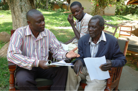 Emails from Kelly Haggart to The Communication Initiative on November 2 2015 and November 18 2015; "Nganyi Community Resource Centre: Community Radio Station Broadcasts Weather Forecasts, Climate Change News to Farmers in Kenya", accessed on November 4 2015; IDRC website, accessed on November 4 2015; "Linking traditional and modern forecasting in Western Kenya"; and "Integrating Indigenous Knowledge in Climate Risk Management to Support Community Based Adaptation: Final Technical Report" [PDF], by Prof. Laban Ogallo, November 9 2010 (accessed on November 4 2015). Image caption/credit: The meteorological officer discusses weather and climatic indicators with the rainmakers in the community. DFID