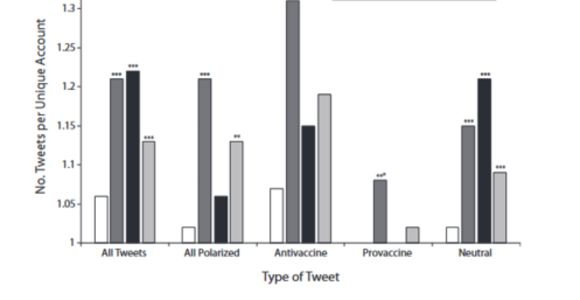 In short, the results "suggest that Twitter bots and trolls have a significant impact on online communications about vaccination." As noted above, malicious online behaviour varies by account type and, as suggested here, can be addressed by different strategies. For example, accounts that are known to distribute malware and commercial content are more likely to promote antivaccination messages, suggesting that antivaccine advocates may use preexisting infrastructures of bot networks to promote their agenda. These accounts may also use the compelling nature of antivaccine content as clickbait to drive up advertising revenue and expose users to malware. When faced with such content, public health communications officials may consider emphasising that the credibility of the source is dubious and that users exposed to such content may be more likely to encounter malware. In fact, antivaccine content may increase the risks of infection by both computer and biological viruses.